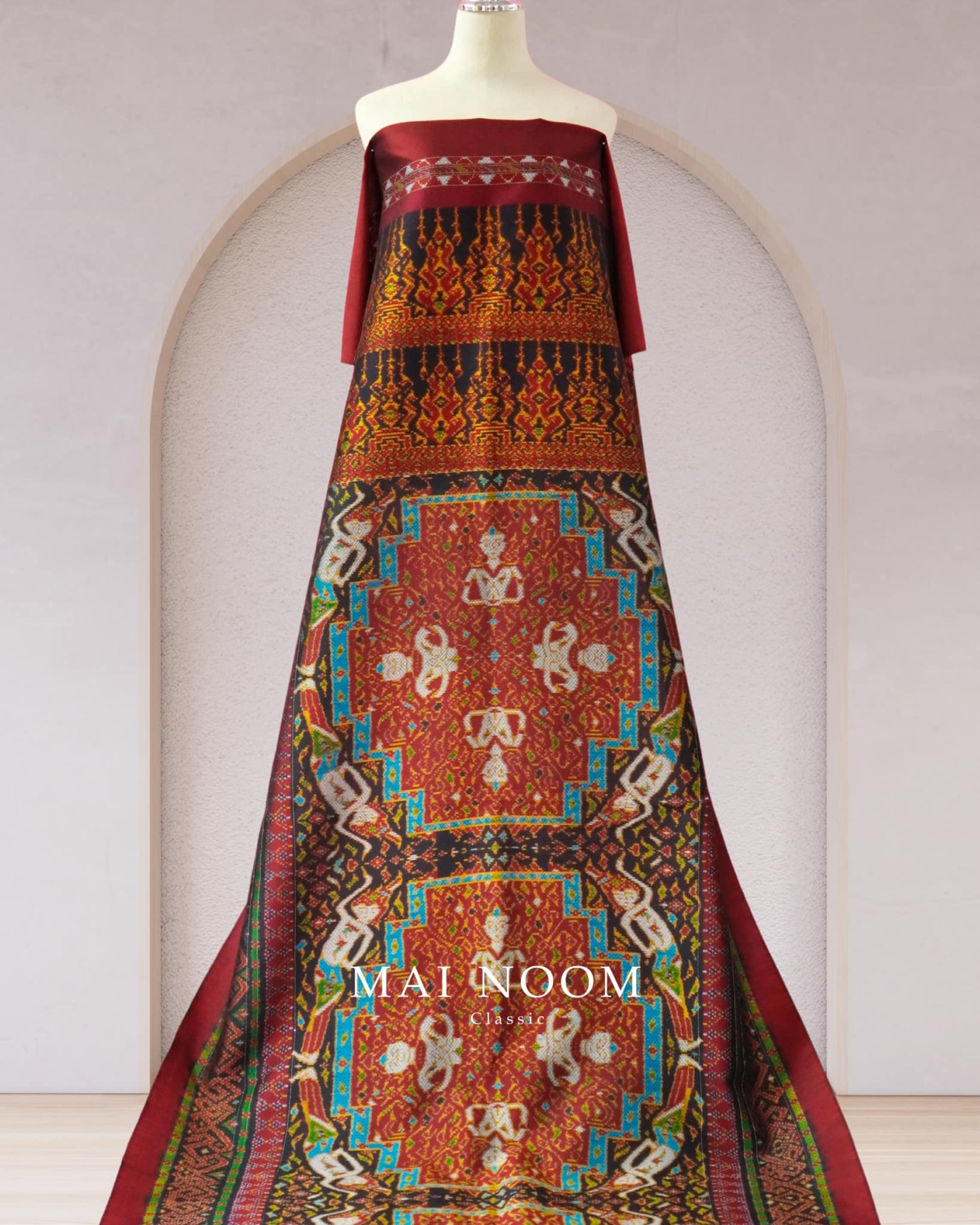 งานทอมือ เทคนิคมัดหมี่ ไหมแท้ ฝีมือช่างชั้นครู ประกอบด้วยหน้านาง 2 ชั้น สังเวียนผ้าล้อมรอบ ช่อแทงท้อง ท้องผ้าเป็นลายเทพพนม ราชวัตรย่อมุมไม้สิบสอง